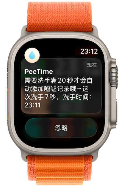 没有嘘嘘,但是洗手后被添加了记录怎么办洗手完成后,手表会弹出通知 洗手时长小于20秒,提示没有自动添加嘘嘘记录: 洗手时长满20秒,提示已经自动添加嘘嘘记录。如果只是普通的洗手,并没有上厕所,可以点击通知中的"撤销记录"按钮,撤销本次记录 你也可以随时打开手机上的PeeTime App,进行记录的编辑、删除、添加等操作。